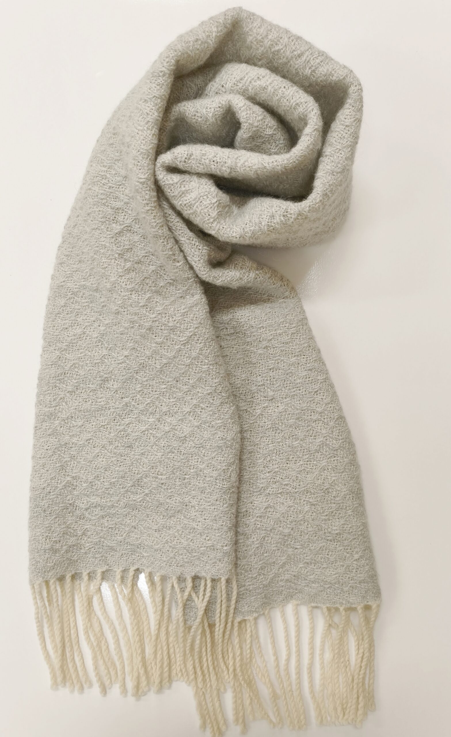 Villane ja soe kangastelgedel kootud sall. Valged narmad ja reljeefne pitisline muster lisavad pidulikkust. Lõng on Lõuna- Eesti lammaste villast kedratud Muru Villavabrikus.